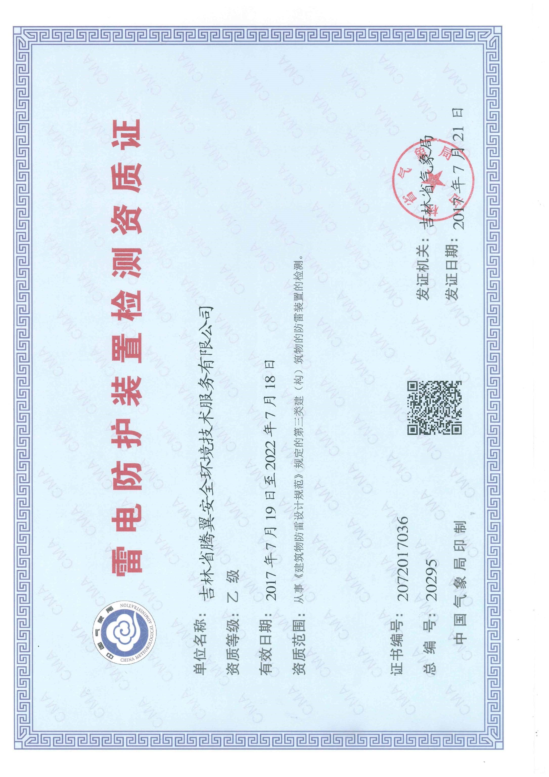 我公司于2017年5月向吉林省氣象局遞交雷電防護(hù)裝置檢測資質(zhì)申請,在申報(bào)資料審查合格后,省氣象局領(lǐng)導(dǎo)及專家于2017年6月23日對我公司進(jìn)行了現(xiàn)場評審,經(jīng)過人員水平測試、資料審核、實(shí)際操作考核等一系列審查,最終結(jié)果符合要求,2017年7月21日通過行政審批,公司取得雷電防護(hù)裝置檢測乙級資質(zhì)證書。