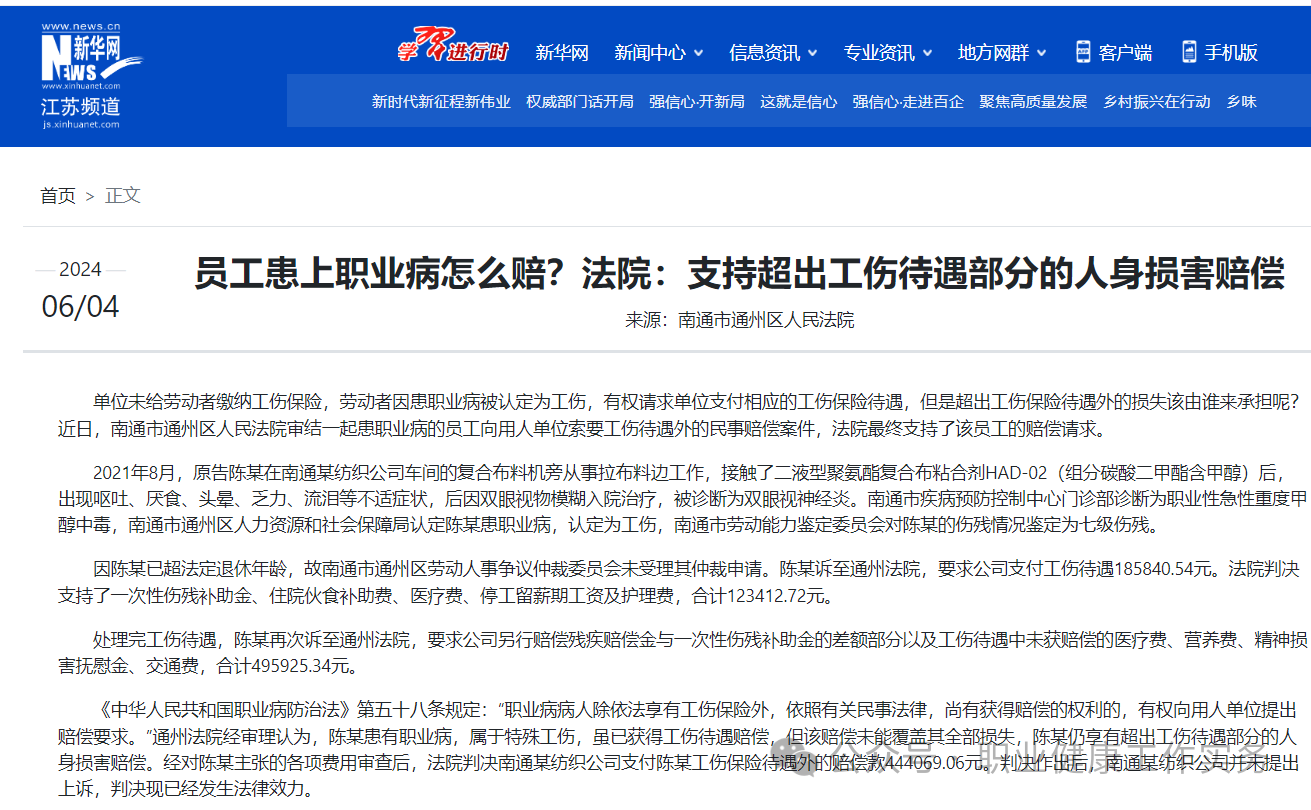 《中華人民共和國職業(yè)病防治法》第五十八條規(guī)定:“職業(yè)病病人除依法享有工傷保險外,依照有關(guān)民事法律,尚有獲得賠償?shù)臋?quán)利的,有權(quán)向用人單位提出賠償要求?!蓖ㄖ莘ㄔ航?jīng)審理認(rèn)為,陳某患有職業(yè)病,屬于特殊工傷,雖已獲得工傷待遇賠償,但該賠償未能覆蓋其全部損失,陳某仍享有超出工傷待遇部分的人身損害賠償。經(jīng)對陳某主張的各項費用審查后,法院判決南通某紡織公司支付陳某工傷保險待遇外的賠償款444069.06元。判決作出后,南通某紡織公司并未提出上訴,判決現(xiàn)已經(jīng)發(fā)生法律效力。